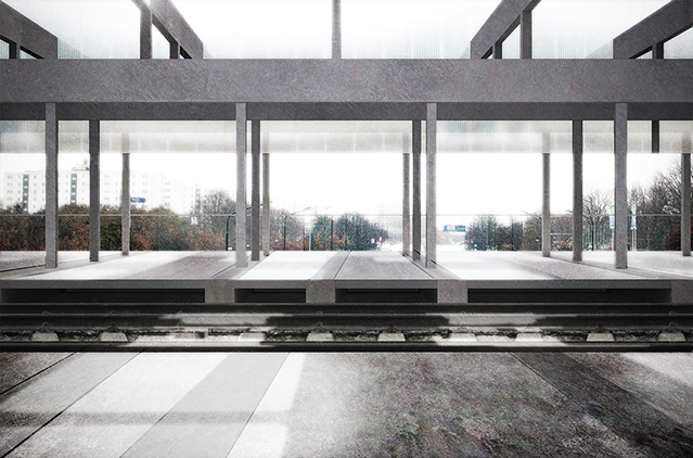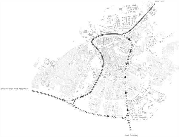 For my final project I chose to design a train station in Malmö, Sweden. A station to help to tie the city and its citizens together. The station will be placed on the edge to the borough of Rosengård. A part of the city which, since being built, has been cut off from Malmö by a elevated railway, running from the north to the south, limiting the possibility of getting into the city to specific tunnels and viaducts. I was looking at different crossings in the city to see what characterized them and then chose to place my station as a cross over the major road out of the city center crossed by the existing railway. By doing this I use the station to tie four areas together in stead of two.