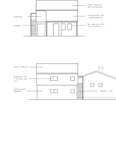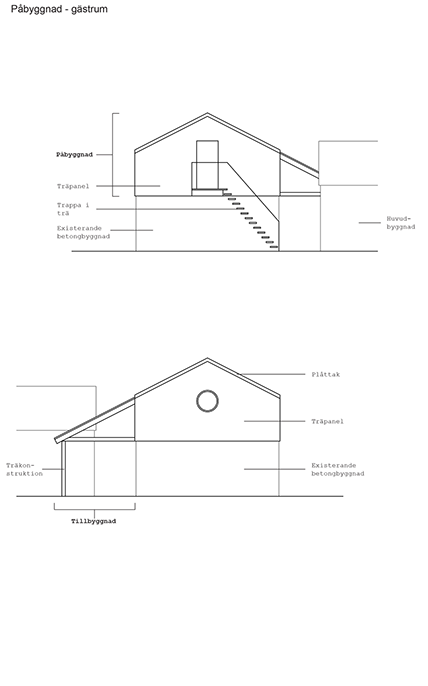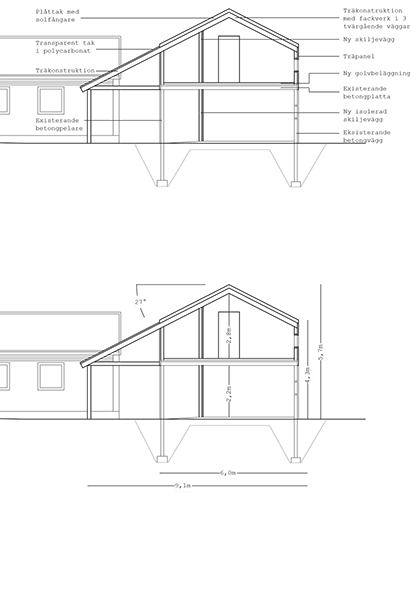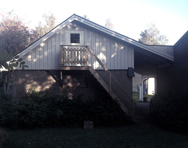 Design and reorganisation of a garage in Örnsköldsvik, Sweden, into workshop, laundry room and guest house on top. Including roof protection for cars with sun cells to the south. First own project, learning how to use the building rules of the municipality. Built together with a carpenter from the region.